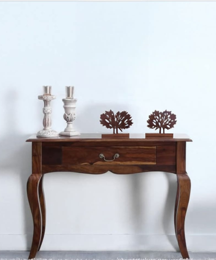 Skillfully crafted from premium Sheesham wood, this table features beautifully curved legs and a polished natural finish that highlights the wood’s rich grains. The single center drawer offers both style and functionality — perfect for storing keys, notepads, or other essentials.